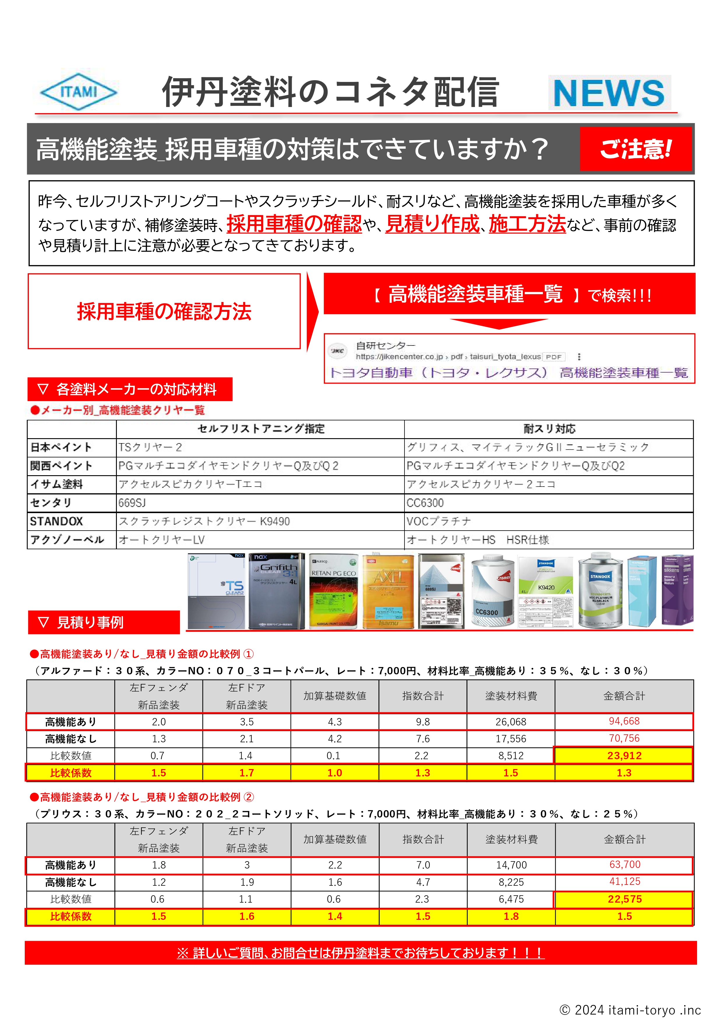 見積りコネタ【高機能クリヤー対応】 イタミのコネタ 2026.01.08 こんにちは! 関東を中心に全国のお客様のニーズにお応えするオートサプライヤー・伊丹塗料株式会社です。 ユーザー様に不定期でご案内している“コネタ”より、 今回は見積りのコネタ【高機能クリヤー対応】を公開いたします。 いかがでしたか? “イタミのコネタ”では、お客様へのお役立ち情報を不定期で配信しております。 ご用命はお近くの伊丹塗料株式会社までお気軽に♪