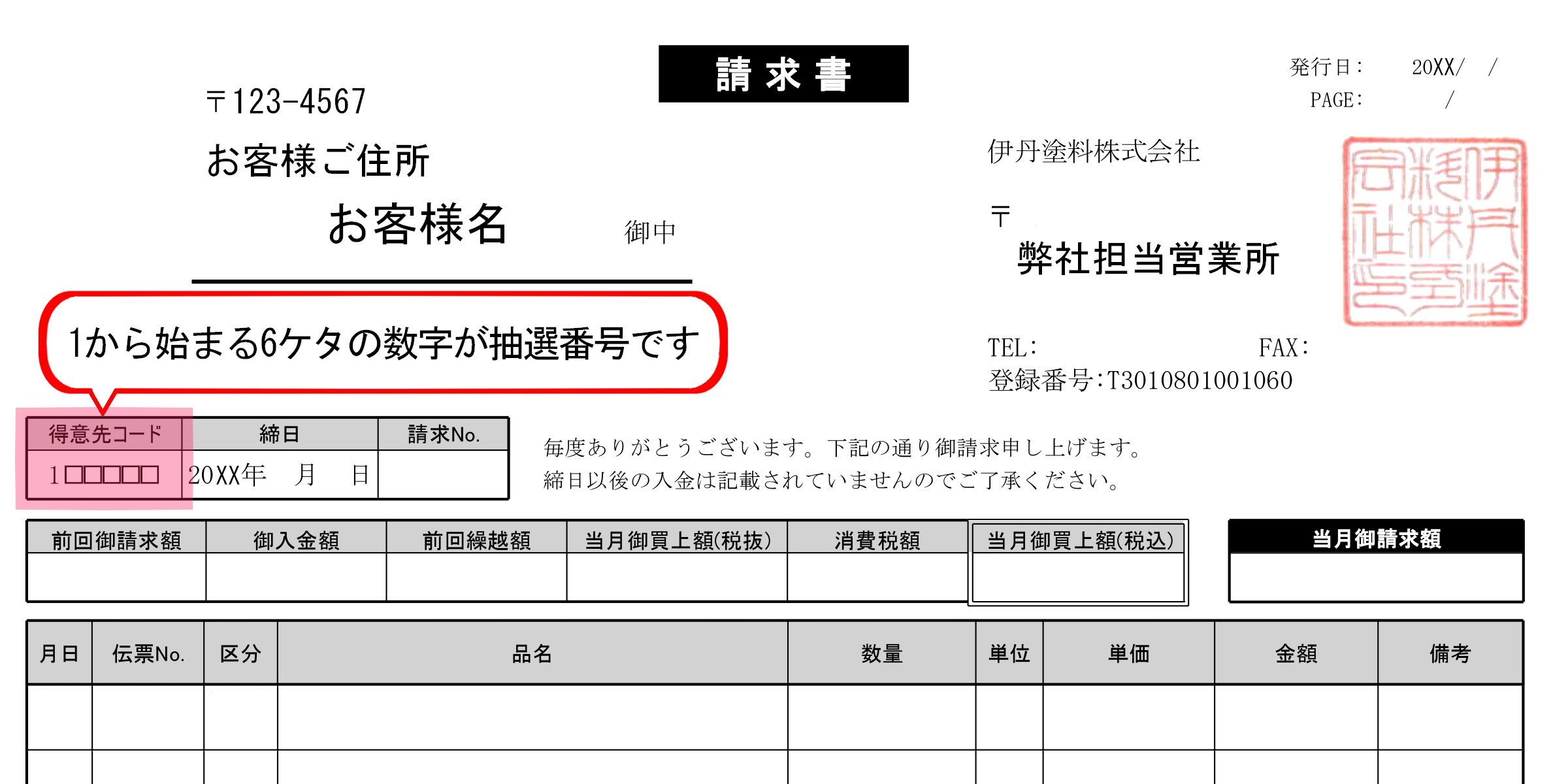 請求書に記載されている、”得意先コード”が抽選番号になります。(下記参照)
