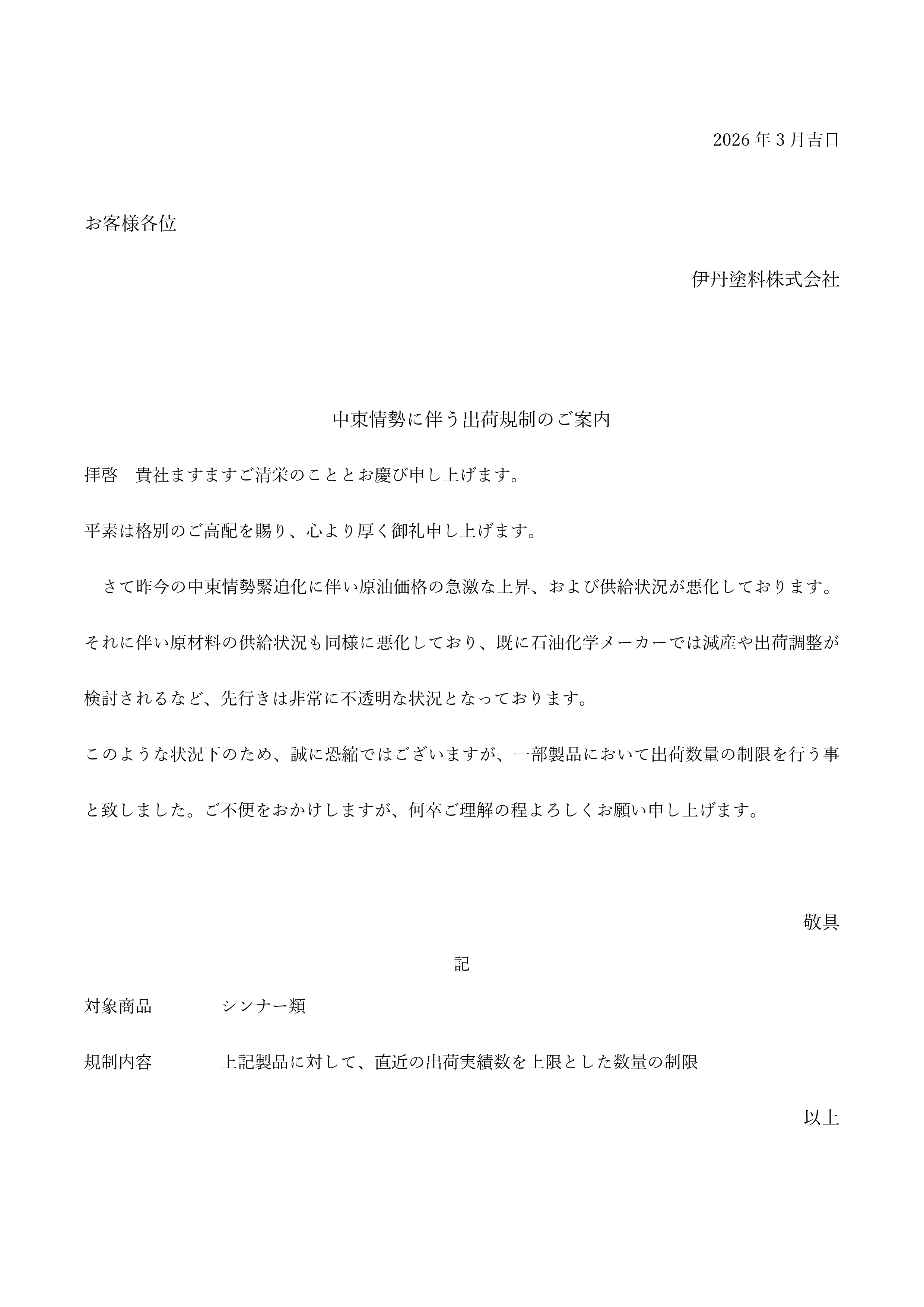 【緊急のお知らせ】中東情勢に伴う出荷規制のご案内